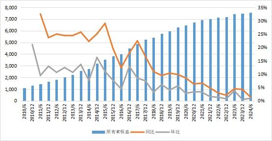 所有者权益方面,与2023年同期相比,整体规模略有增加。截至2024年2季度末,信托公司所有者权益规模达到7554.22亿元,较2023年4季度末增加69.07亿元,较2023年同期增加105.26亿,同比增速1.41%。